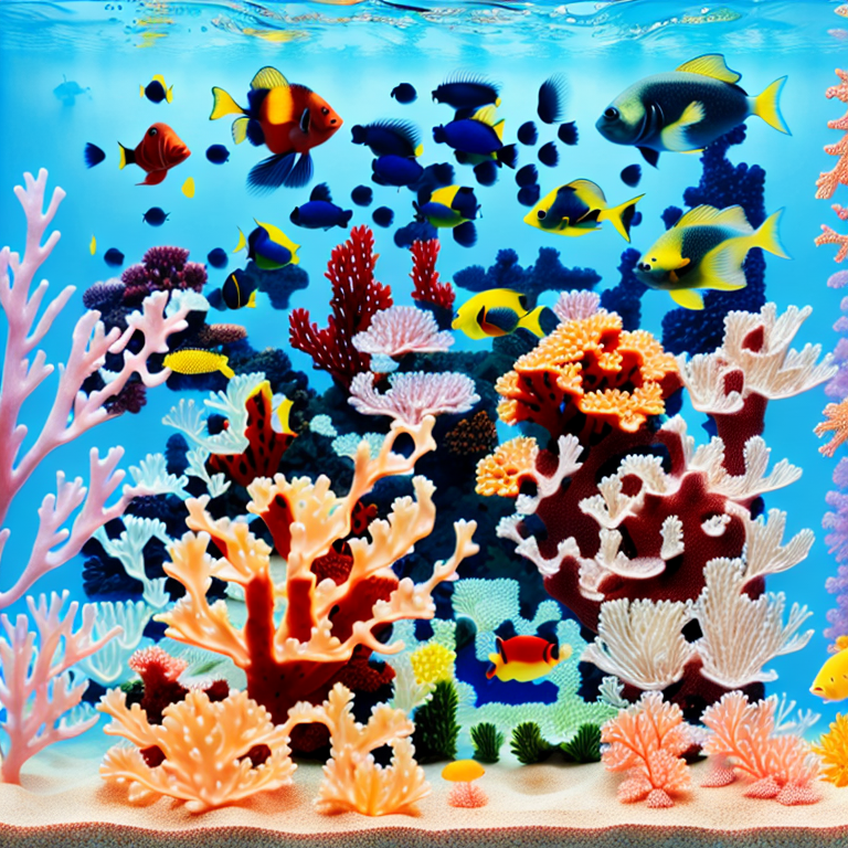 masterpiece, best quality, 4k, a large aquarium with many different types of corals and fish swimming around it, and a large amount of water, highly detailed digital art, underwater, sand, rock