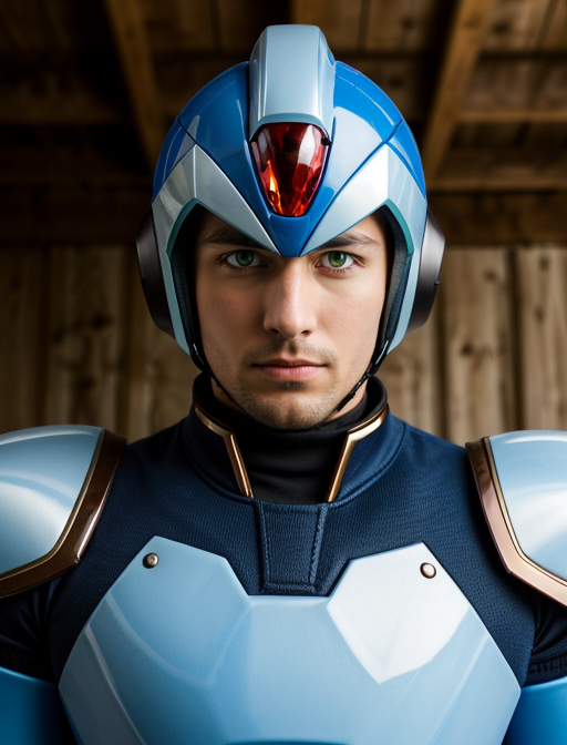 best quality, masterpiece, highres, detailed, realistic, cosplay, .35mm, <lora:Detail - add_detail:0.2>, 1man, android, XRockman, blue helmet, green eyes, red crystal, blue armor, <lora:Character - XRockman:0.7>, barn,