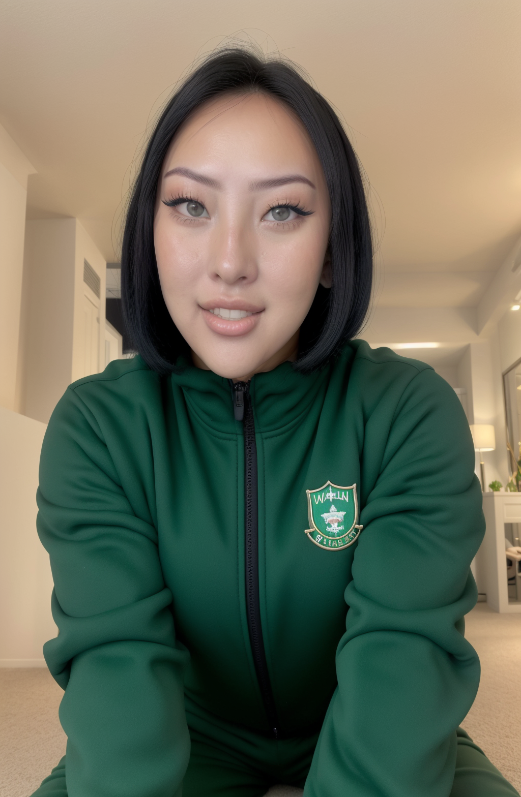 @yawoesenpai,WoeSenpai \(Person\),Alexandra Cohen \(Person\),1girl, ((portrait shot)),green eyes, smile, closed mouth,looking at viewer, black hair, nose, very small breasts, makeup, tracksuit background: indoors, nature, upper body, <lora:WoeSenpai | Alexandra Cohen:1>