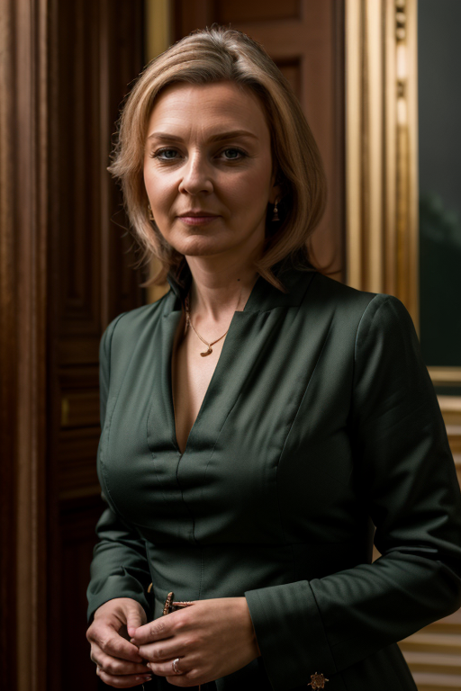 <lora:Liz_Truss:1> masterpiece, best quality, detailed face, 1woman, solo, a mature l1873t, realistic, green dress