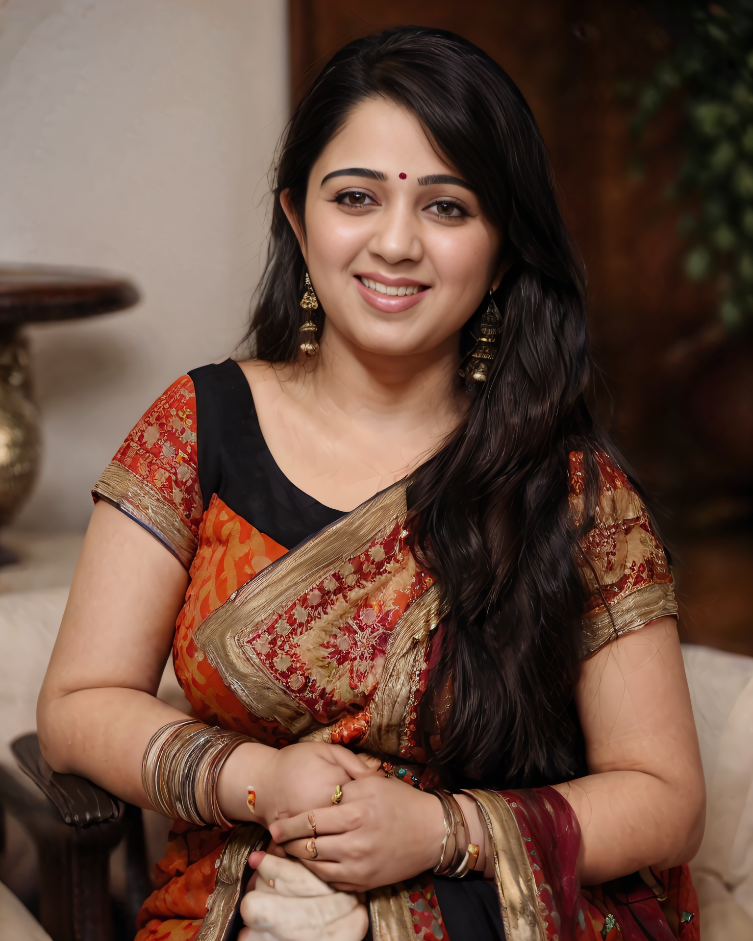 photo of a chrmi woman full body in a dynamic pose wearing elegant high-neck colorful intricate Kashmiri Pashmina Suit covering chest area, looking at camera, smiling, perfect eyes, at a simple beautiful bokeh <lora:chrmi_Charmi_Kaur_SD15_LoRA_prodigy_local_regs-000002:0.9>