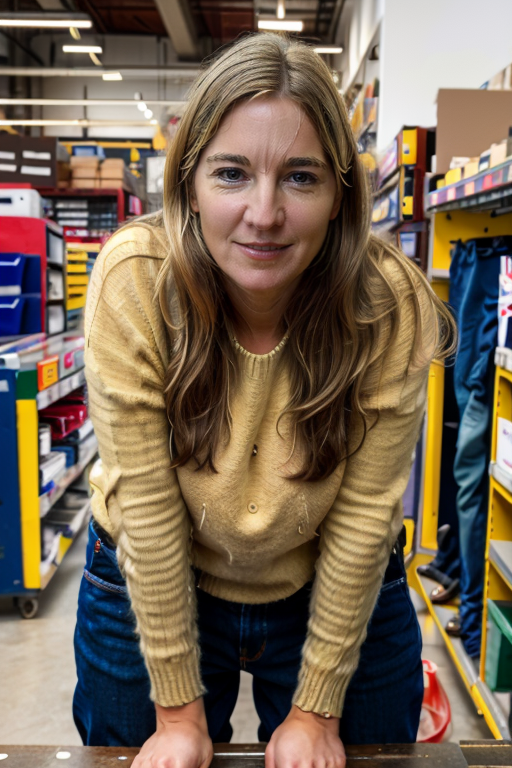 <lora:VC:1.0> masterpiece, best quality, detailed face, 1girl, realistic, solo, a 40 year old, mature, v1873c, long_hair, blonde_hair, in a hardware shop, drills, mechanical, jumper, jeans