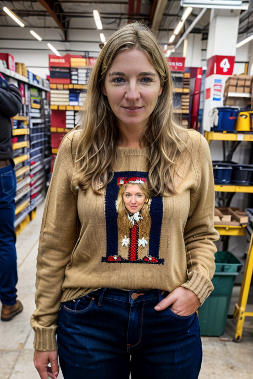 <lora:VC:1.0> masterpiece, best quality, detailed face, 1girl, realistic, solo, a 40 year old, mature, v1873c, long_hair, blonde_hair, in a hardware shop, drills, mechanical, jumper, jeans