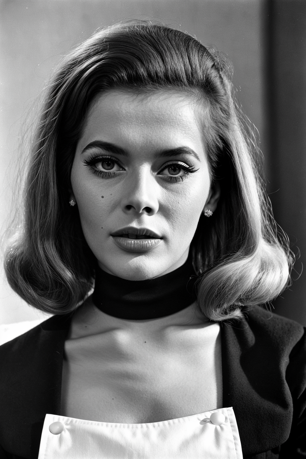 <lora:[UK]_-_Honor_Blackman:0.8> pussygalore, monochrome, woman in uniform, 1960s style, cinematic, highly realistic,