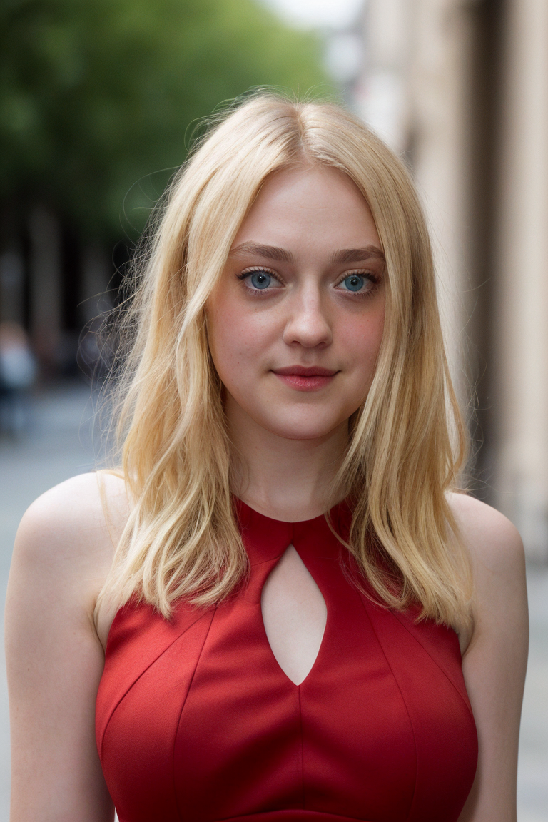a picture of dakota15 woman,young, blonde hair,detailed skin, surface scattering, bokeh, skin pores, city streets,wearing a red dress,outdoors, looking at viewer ,(subtle smile:0.5), blue eyes, <lora:dakota15 (5):1>