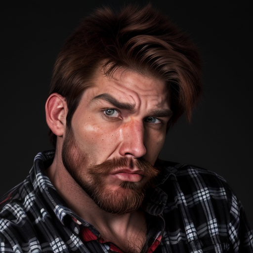 A bearded lumberjack man with a red flannel shirt, muscular build, scruffy facial hair, and brooding look. Photorealistic black and white photograph, high contrast,zoolanderFace, slightly puckered lips, defined cheekbones,<lora:zoolanderFaceTest2-000006:1>