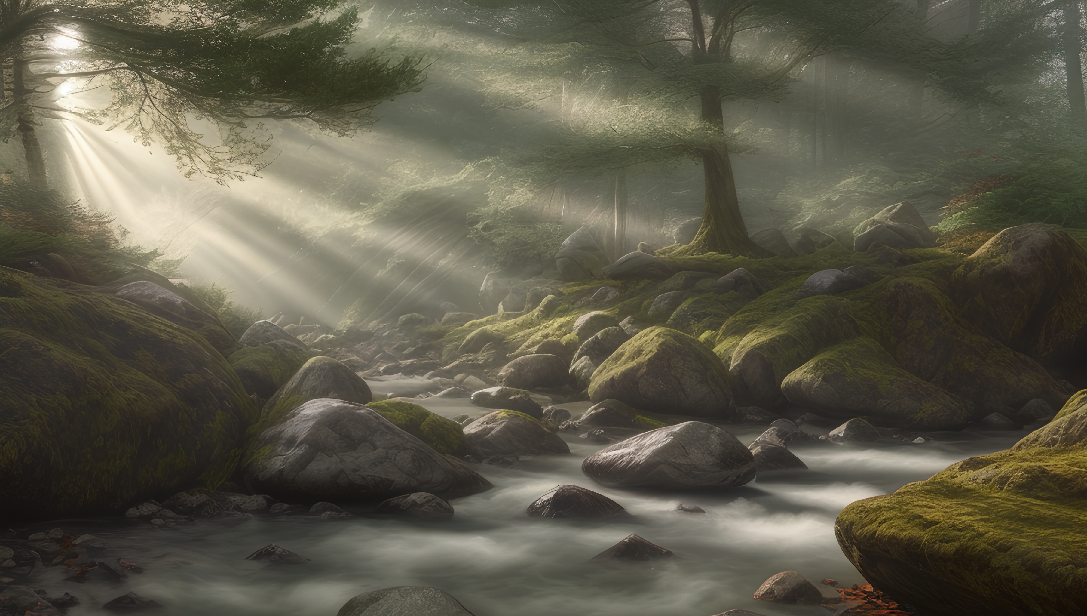 forst landscape, many trees, light coming through trees, fog, god rays, stones, fallen leaves, rock formation, river in the forground, realistic, highly detailed, cinematic, detailed, vibrant, photo realistic, dramatic, sharp focus, 8k,