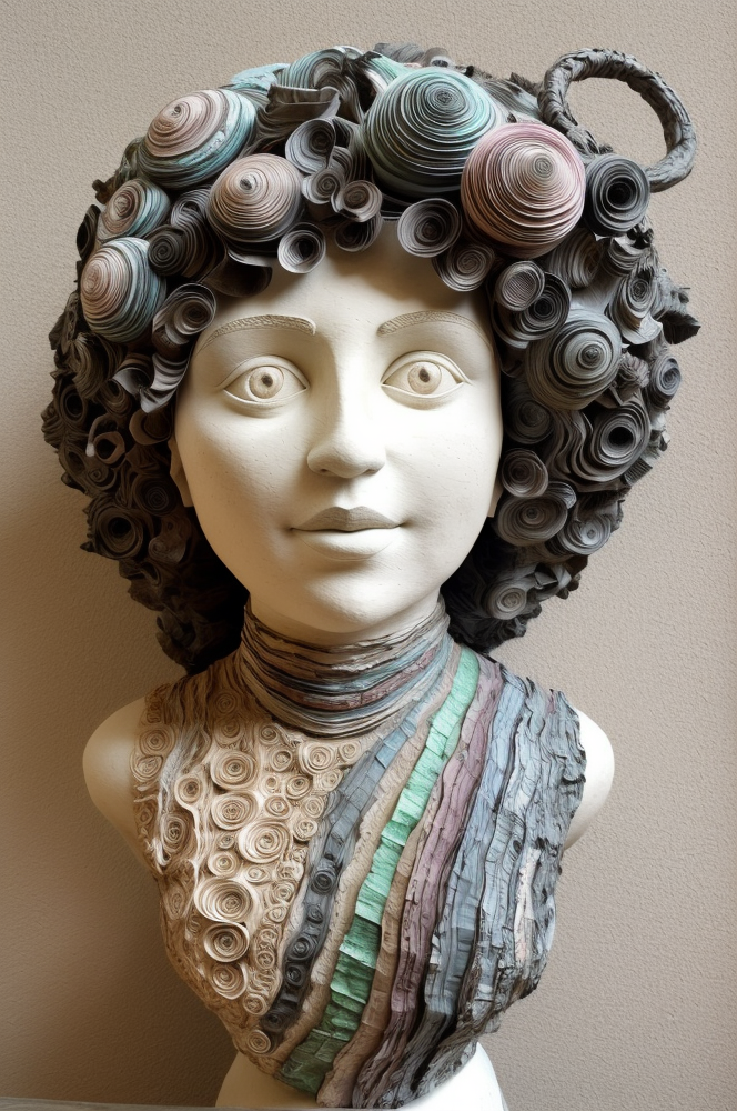 paper mache representation of curly girl, in mountain, amazing details, full of life, 3D, sculptural, textured, handmade, vibrant, fun