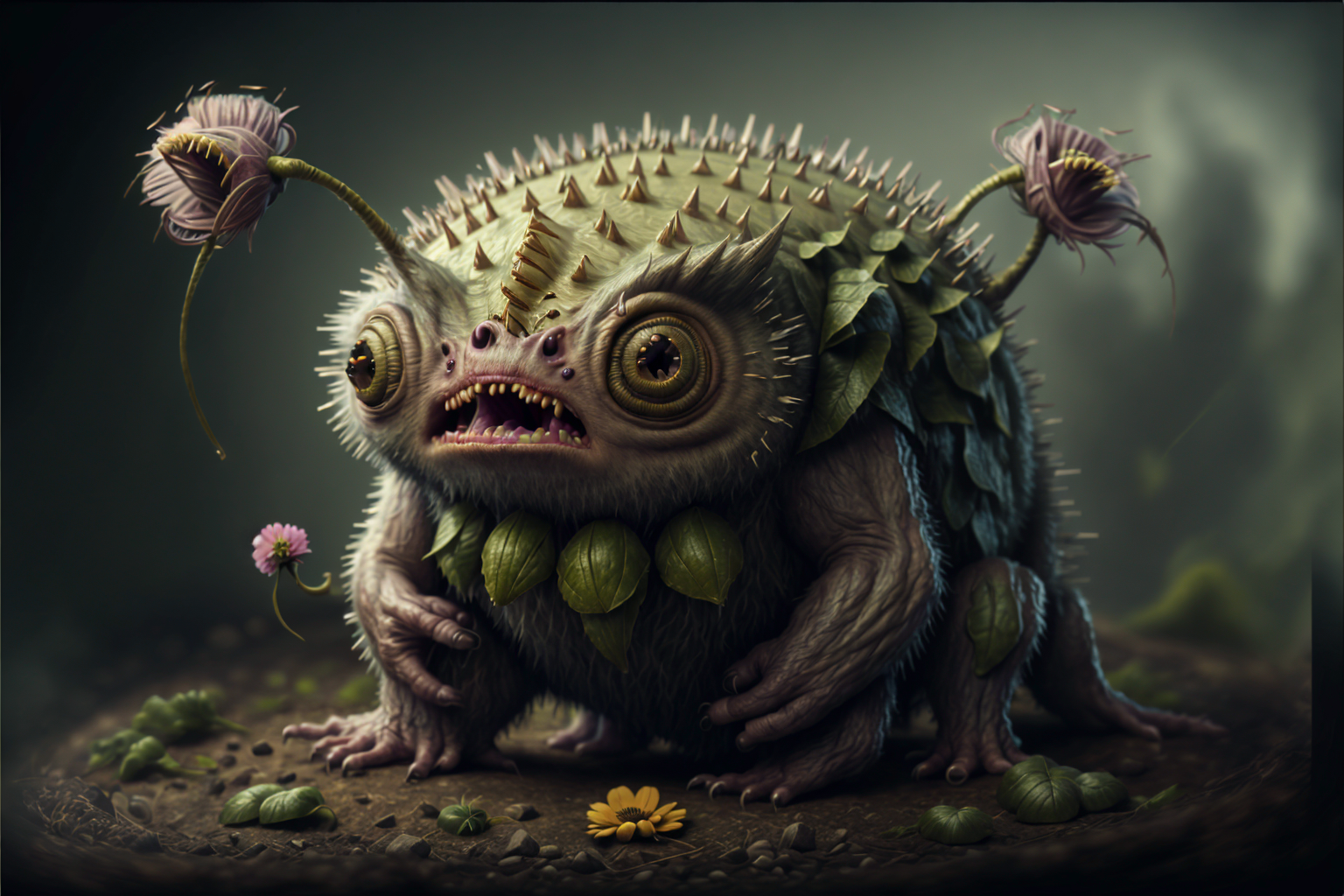 horrible creature, furry, with big teeth, picking flowers, close-up shot <lora:Plantas:0.8> <lora:BugattiAI:0.8> Cu73Cre4ture