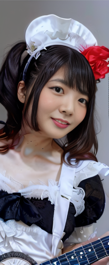 girl in a main costume playing the guitar with a flower on her head, beautiful Japanese face <lora:MikuV4-15:1> nude , (sexy lingerie:1.2)