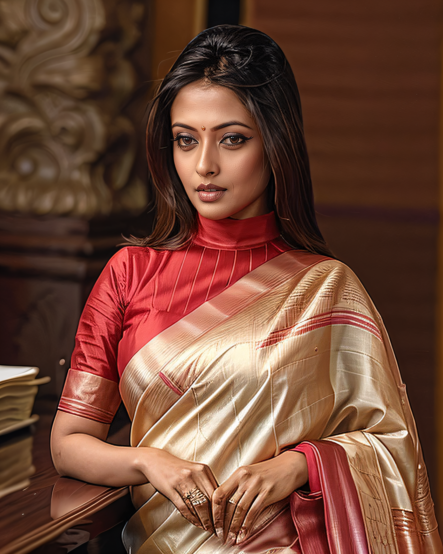 photo of a riya woman in a dynamic pose wearing elegant high-neck Kanjeevaram Silk Saree looking at camera with Tight-lipped determination expression, film grain, perfect eyes, at a capitol building beautiful bokeh <lora:riya_Riya_Sen_SD15_LoRA_adafactor_local:1>