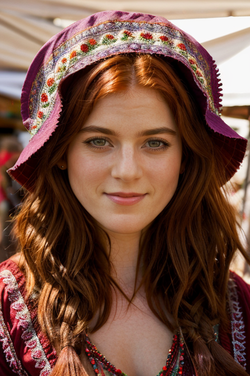 gypsy costume , market stall , evening <lora:Rose_Leslie:1> masterpiece, best quality, detailed face, a mature r1873l, 1girl, solo, red hair,