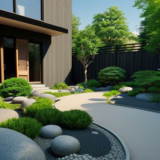 A zen garden style of a sleek modern house, small garden, backyard garden, in the morning, blue sky, photo realistic, realistic leaves, realistic trees, realistic plants, (curved garden pathway), highly detailed, high contrast, hires, 4k, 8k, raw photo, masterpiece