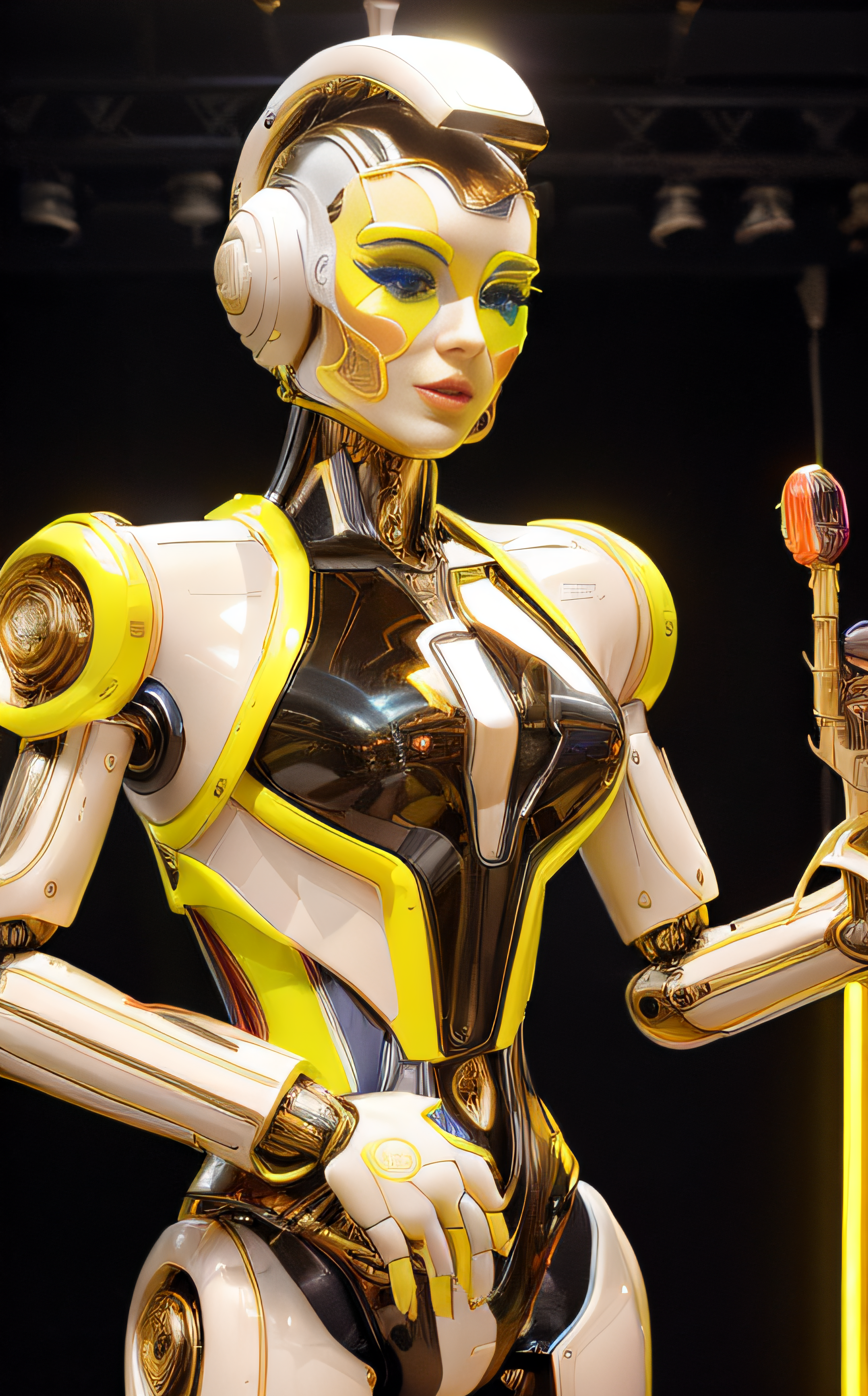 Pop Art style ((bright neon colors)), (top-quality, 8K, masterpiece:1.3) A photo of a sleek, humanoid robot, playing a musical instrument, wearing a stylish jacket, on a modern stage taken with a prime lens highly detailed, detailed skin, dramatic spotlighting <lora:IvoryGoldAIv2:1> ivory gold . Bright colors, bold outlines, popular culture themes, ironic or kitsch