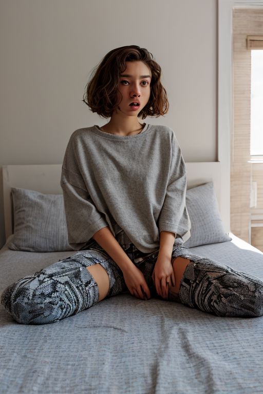 Laying down, on bed, daytime light, shocked expression, nude, gigantic breasts, large areoles