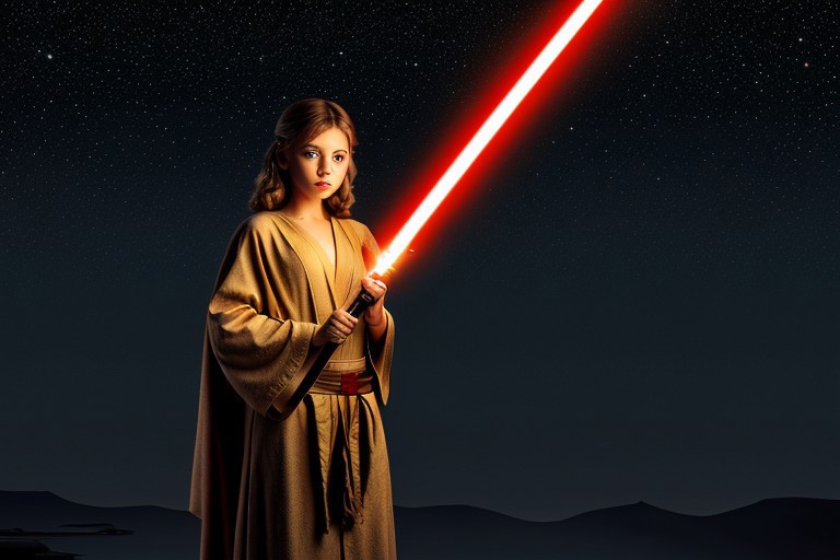 image retro 1980 years style, a single model woman bunette, huge boobs and wide hips, tiny clothe transparet toga greek, using jedi lightsaber in hand, full view standing from head to toes, dark background stars space