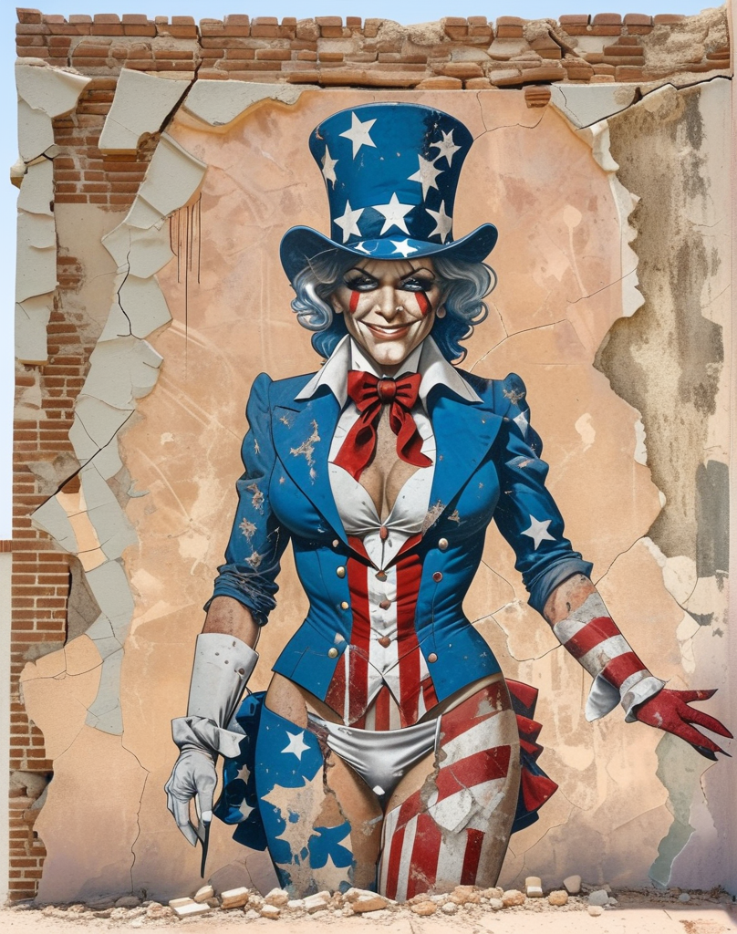 Uncle Sam as a sexy woman, faded mural, cracks, exposed brickwork<lora:Wall_XL:1>
