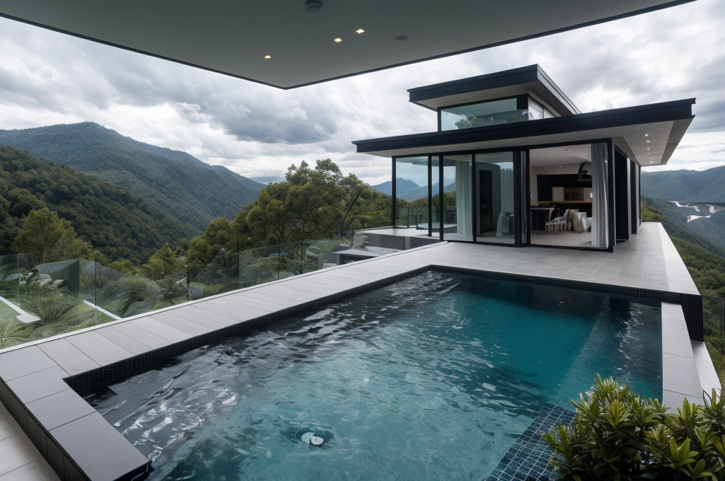 modern villa into the montain, on the edge of a cliff surrounded by waterfalls, cloudy weather, intricated architecture, (masterpiece),(high quality), best quality, real,(realistic), super detailed, (full detail),(4k),8k,pool, window, no humans, scenery, indoors,<lora:å·è°_Cool tones:1.0>