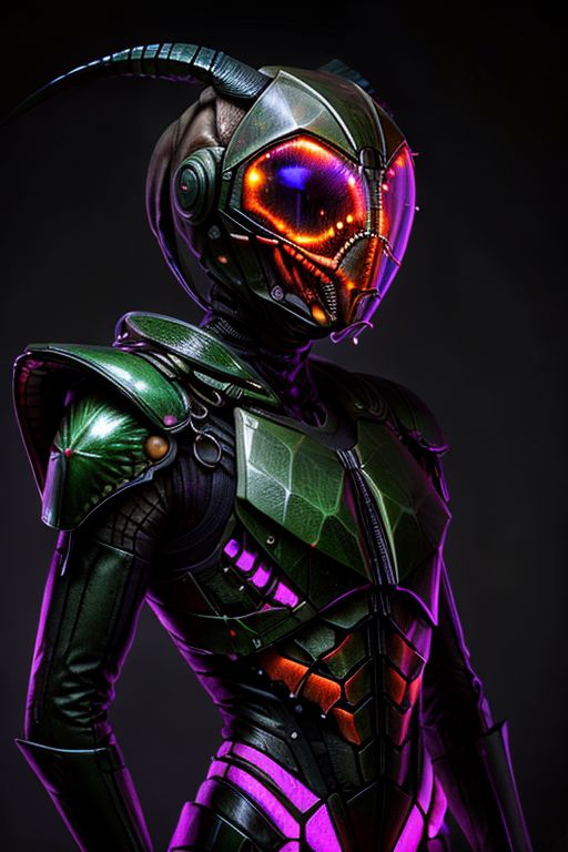 portrait of (beautiful face, long neck, slender arms)) bulletproof vest, helmet with horns, Mantis, greater stag beetle, crab, (purple glowing), detailed background, floating particles, darkness,