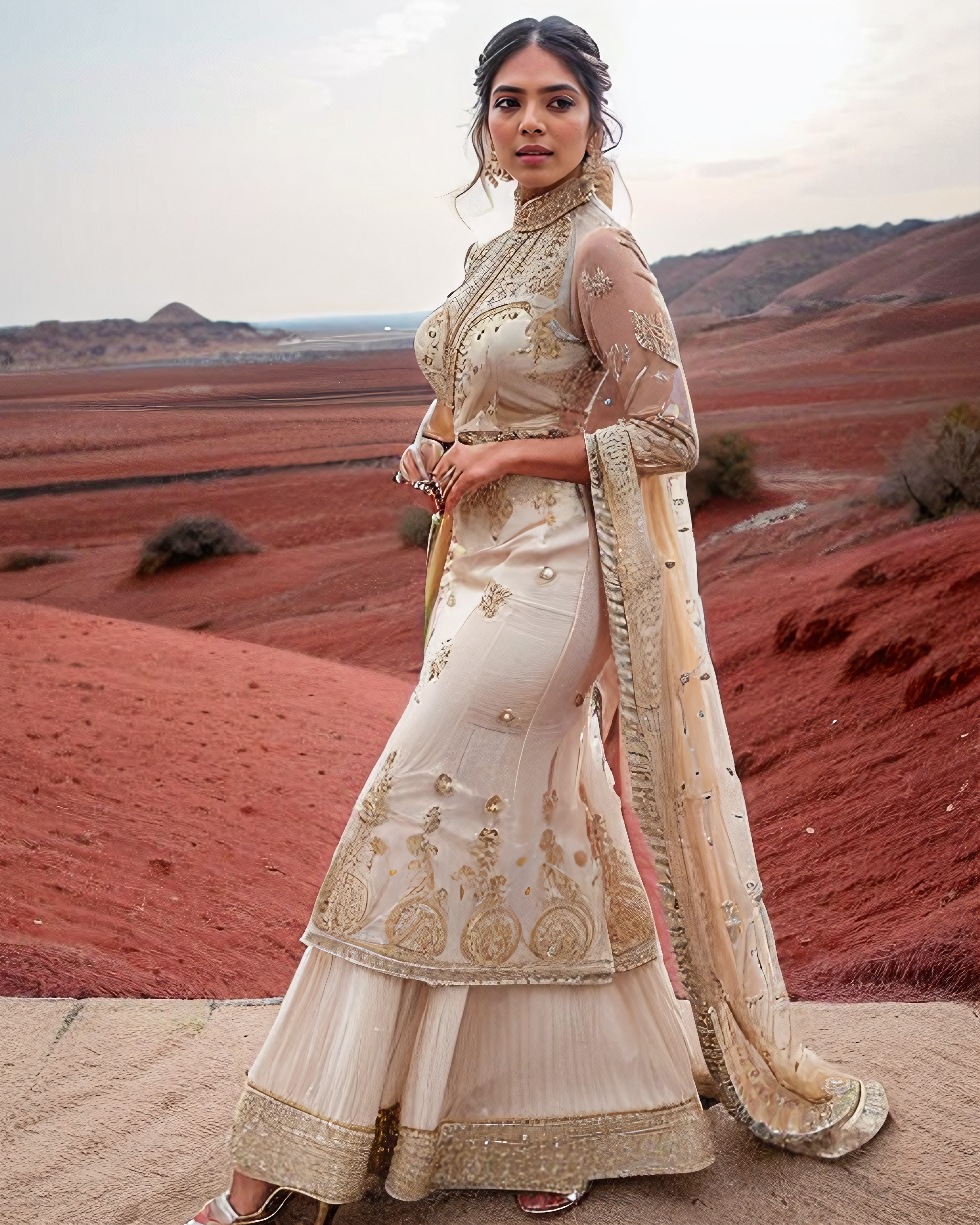 ultra-realistic hires photo of a (mamo woman), looking looking at viewer, elegant high neck Indo-Western Gown with intricate details, fashion shoot, Birdâs-eye view camera angle <lora:mamo_Malavika_Mohanan_SD15_LoRA_Adafactor:1>