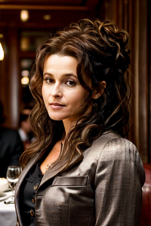 masterpiece,best quality, detailed face, business suit, in a restaurant,<lora:Helena_Bonham_Carter:1> 1girl, solo, a mature 40 year old hb1873c, brown hair, wavy,messy,up do, hair,