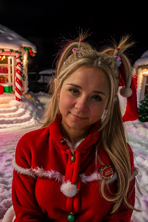mrs santa claus, santas grotto, north pole, elves, snowmen, candy canes, snow, icicles, <lora:Sarah_Jane_Honeywell:1> masterpiece, best quality, detailed face, 1girl, solo, a young sj1873h, blonde_hair Pig Tail