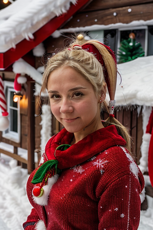 mrs santa claus, santas grotto, north pole, elves, snowmen, candy canes, snow, icicles, <lora:Sarah_Jane_Honeywell:1> masterpiece, best quality, detailed face, 1girl, solo, a young sj1873h, blonde_hair pony tail