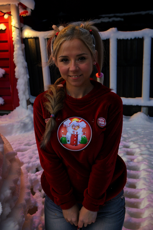 mrs santa claus, santas grotto, north pole, elves, snowmen, candy canes, snow, icicles, <lora:Sarah_Jane_Honeywell:1> masterpiece, best quality, detailed face, 1girl, solo, a young sj1873h, blonde_hair pony tail
