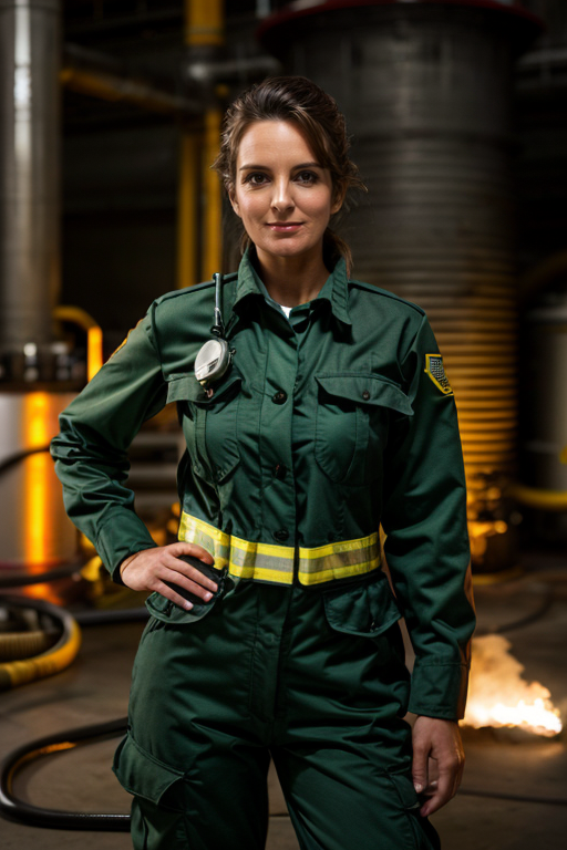 firefighter costume , nuclear powerplant , day <lora:Tina_Fey:1> 1girl, solo, a mature t1873f, masterpiece, best quality, detailed face,