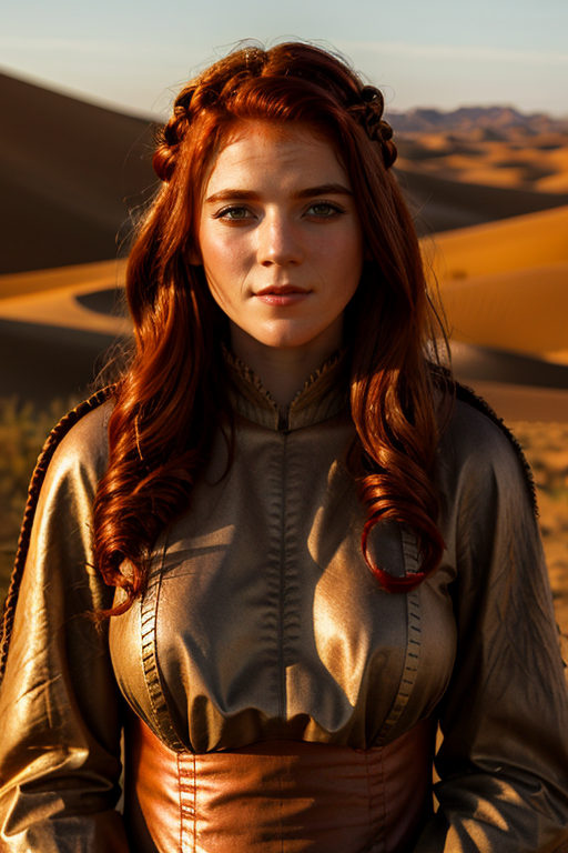 medieval costume , desert , night <lora:Rose_Leslie:1> masterpiece, best quality, detailed face, a mature r1873l, 1girl, solo, red hair,