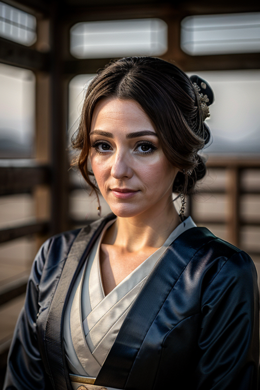 <lora:Suranne_Jones:1> masterpiece, best quality, detailed face, a mature s1873j, 1girl, solo, geisha costume , military base , dusk