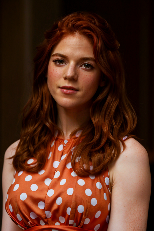 <lora:Rose_Leslie:1> masterpiece, best quality, detailed face, a mature r1873l, 1girl, solo, red hair, <lora:Sexy Polka Dot Dress by Stable Yogi:0.7> wearing Sexy burnt orange Polka Dot Dress,