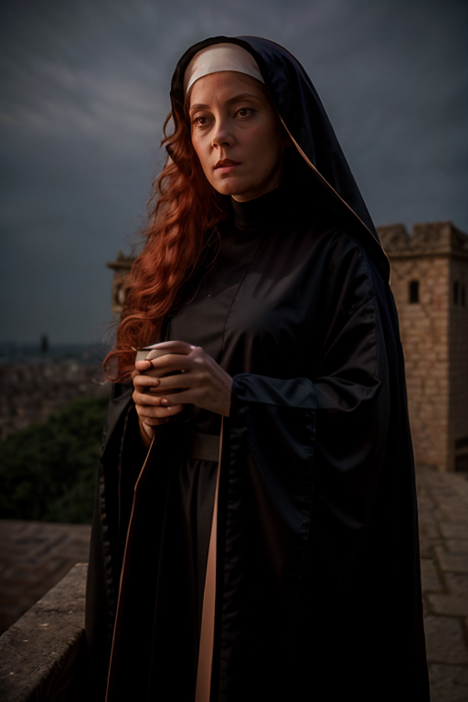 nun costume , tower , dusk <lora:Susan_Sarandon:1> masterpiece, best quality, detailed face, solo, a woman, mature s1873s, red hair, long_hair, looking_at_viewer