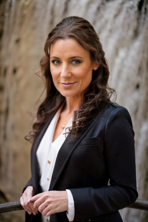 conductor costume , waterfall , evening <lora:Orla_Brady:1> masterpiece, best quality, detailed face,, 1girl, solo, a mature o1873b, brown_eyes, realistic, brown_hair, long_hair, posing,