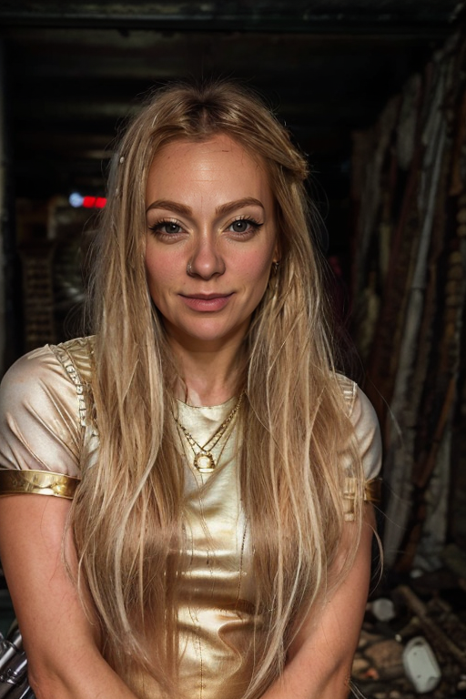 <lora:Cherry_Healey:1> masterpiece, best quality, detailed face, 1girl, solo, realistic, c1873h, long blonde_hair, herald costume , wasteland , evening