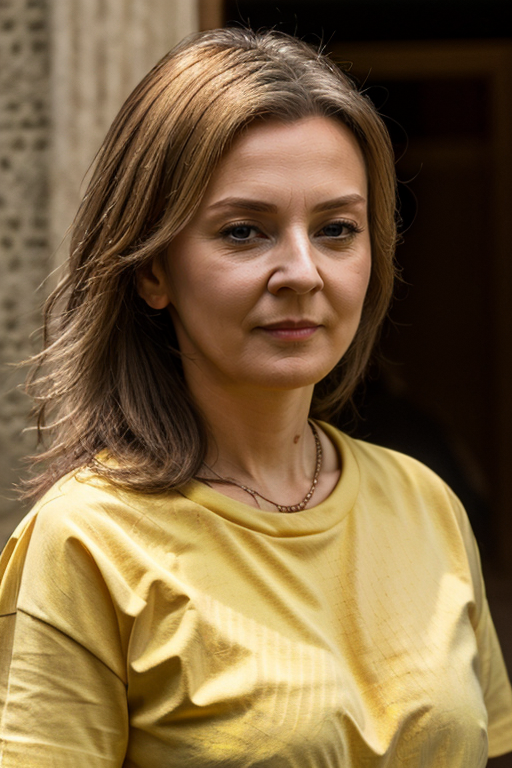 <lora:Liz_Truss:1> masterpiece, best quality, detailed face, 1woman, solo, a mature l1873t, realistic, yellow t-shirt