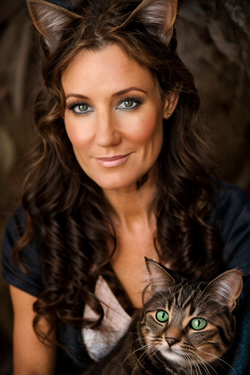 cat costume , cave , night <lora:Orla_Brady:1> masterpiece, best quality, detailed face,, 1girl, solo, a mature o1873b, brown_eyes, realistic, brown_hair, long_hair, posing,