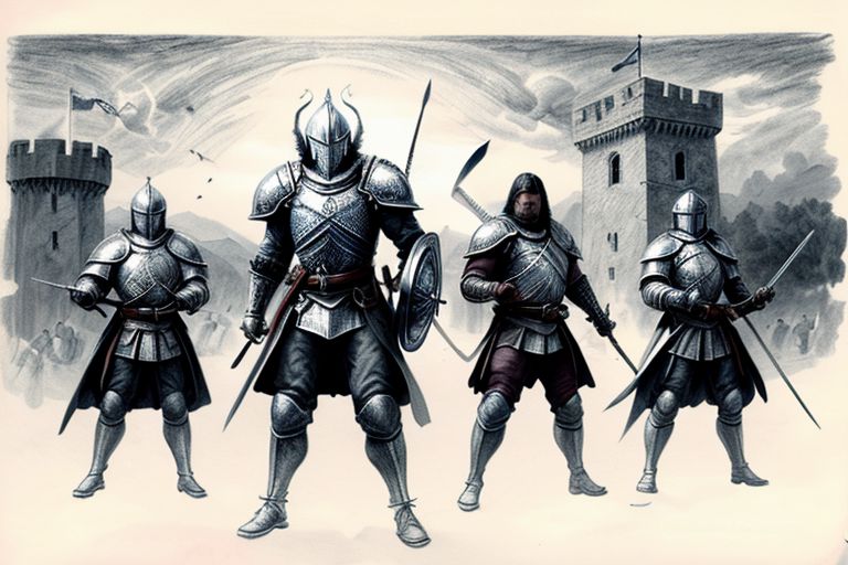 Pencil sketch, intricately detailed, rich shadows, highest resolution, highest quality, 8k UHD, best perfect realistic HD ultra HD 4k clear and detailed image, battle knights with a large and fearful fire dragon, nearby castle, weapons swords, crossbows, bows, detailed visualizations of knights, dragon and landscape, detailed depiction of their faces and weapons and armor, and o ...