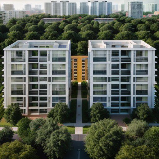 RAW photo of many residential 9-floor high buildings, surrounded by trees and roads, common garden, birds-eye view, 1man, flower, bush, render, matte colored facade, entire building, wide shot, architectural view, 8k uhd, dslr, soft lighting, high quality, film grain, Fujifilm XT3, <lora:lan_architecture_visualization:0.82>