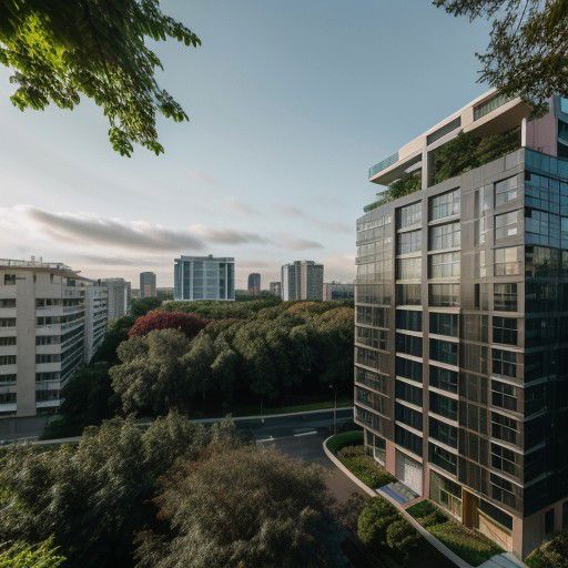 RAW photo of many residential 9-floor high buildings, surrounded by trees and roads, common garden, birds-eye view, 1man, flower, bush, render, matte colored facade, entire building, wide shot, architectural view, 8k uhd, dslr, soft lighting, high quality, film grain, Fujifilm XT3, <lora:lan_architecture_visualization:0.82>