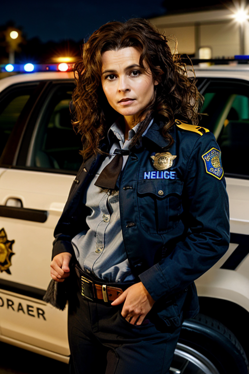<lora:Helena_Bonham_Carter:1> 1woman, solo, mature hb1873c, , brown_hair, wavy hair, messy hair, policewoman costume , parking lot , night