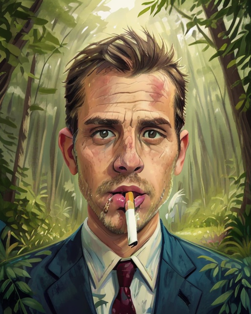 <lora:COOLKIDS_MERGE_V2.5:1> portrait of hntr man, stubble, tired ciginmouth, a whimsical fantasy painting, forest setting, <lora:HunterBiden_hntr_55_1:1> <lora:ciginmouth:.8>