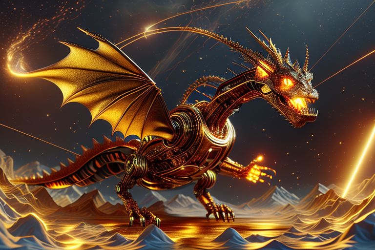 Robot dragon in the sky, wings spread, breathing lasers. midasmagic, golden aura
