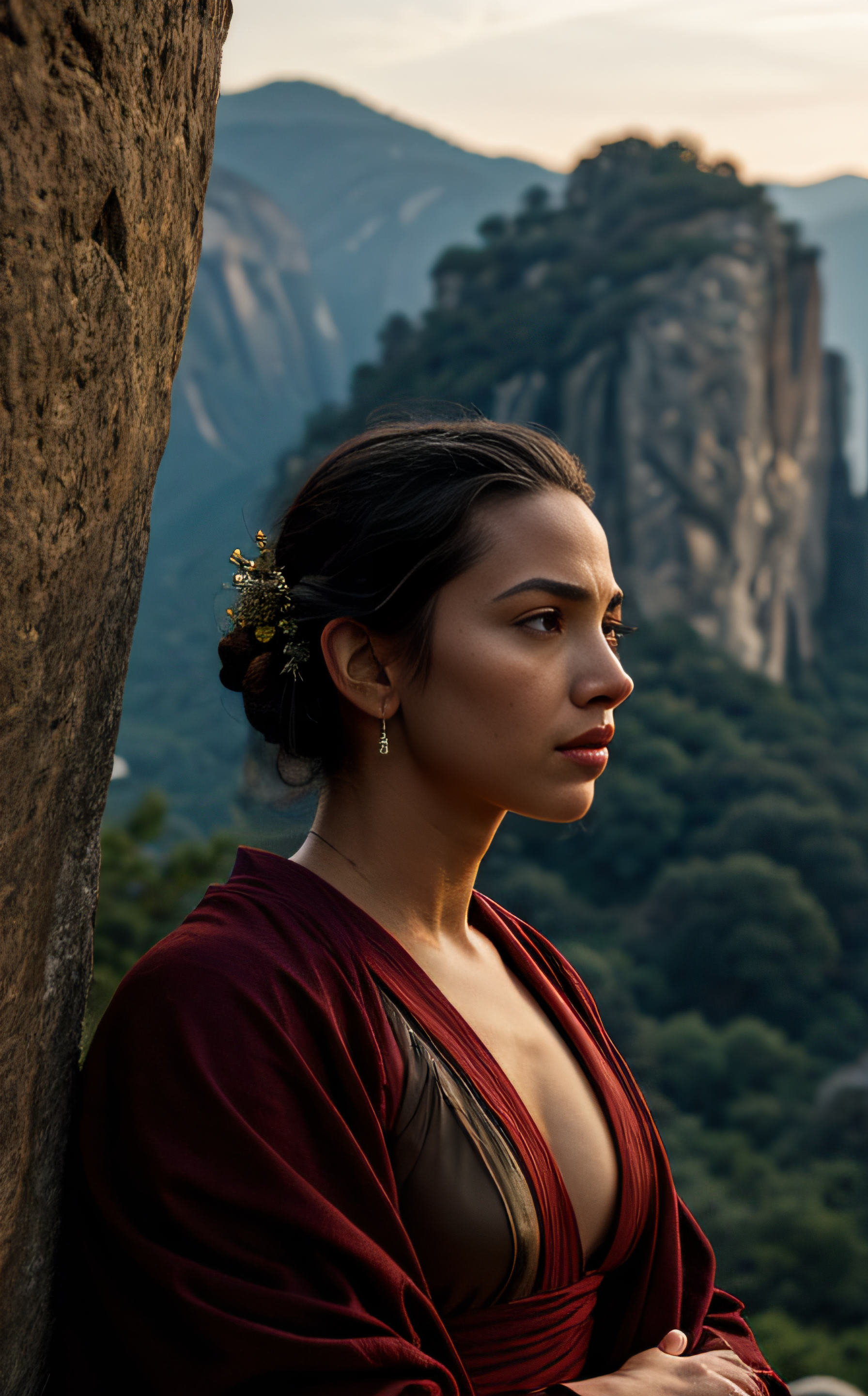 cinematic film still beautiful face, sexy, (Top-quality, 8K, Masterpiece: 1.3) A photo of the powerful Earthbender, Avatar Aang, bending a massive pillar of rock with ease, clad in his Air Nomad robes, against the backdrop of a serene mountain landscape, taken with a telephoto lens, accentuating the intricate details of his bending technique and focused expression, illuminated by the soft light of dusk. <lora:epi_noiseoffset2:1> . shallow depth of field, vignette, highly detailed, high budget, bokeh, cinemascope, moody, epic, gorgeous, film grain, grainy