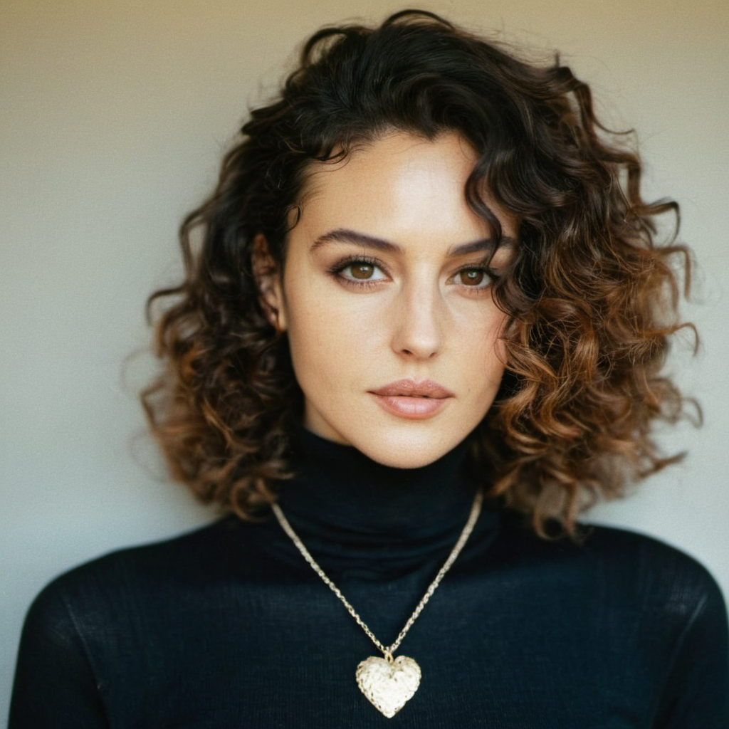Looking straight at the camera, Film grain, skin texture, Instagram closeup selfie of a woman with beautiful wavy hair wearing a heart necklace,f/1.8,wearing a tutleneck shirt, <lora:monbellucci_xl_1_standard_merger_28_39_70_03_05_02:1>