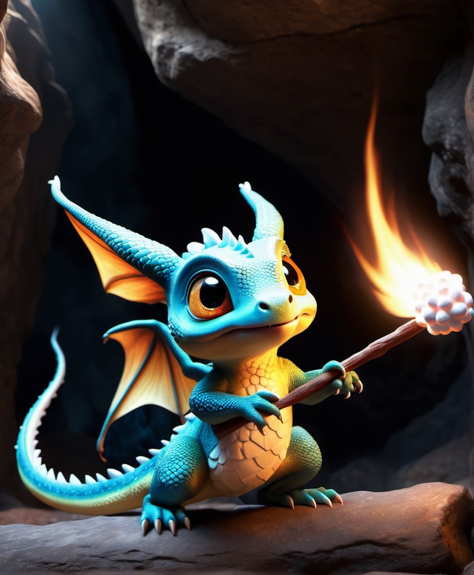 illustration, realistic photo of a little dragon, big eyes, spread wings, holding a stick with marchmallow, breathes fire, in a cave, photorealistic, hyperrealism, 64k, cinamatic light, <lora:add_detail:1>
