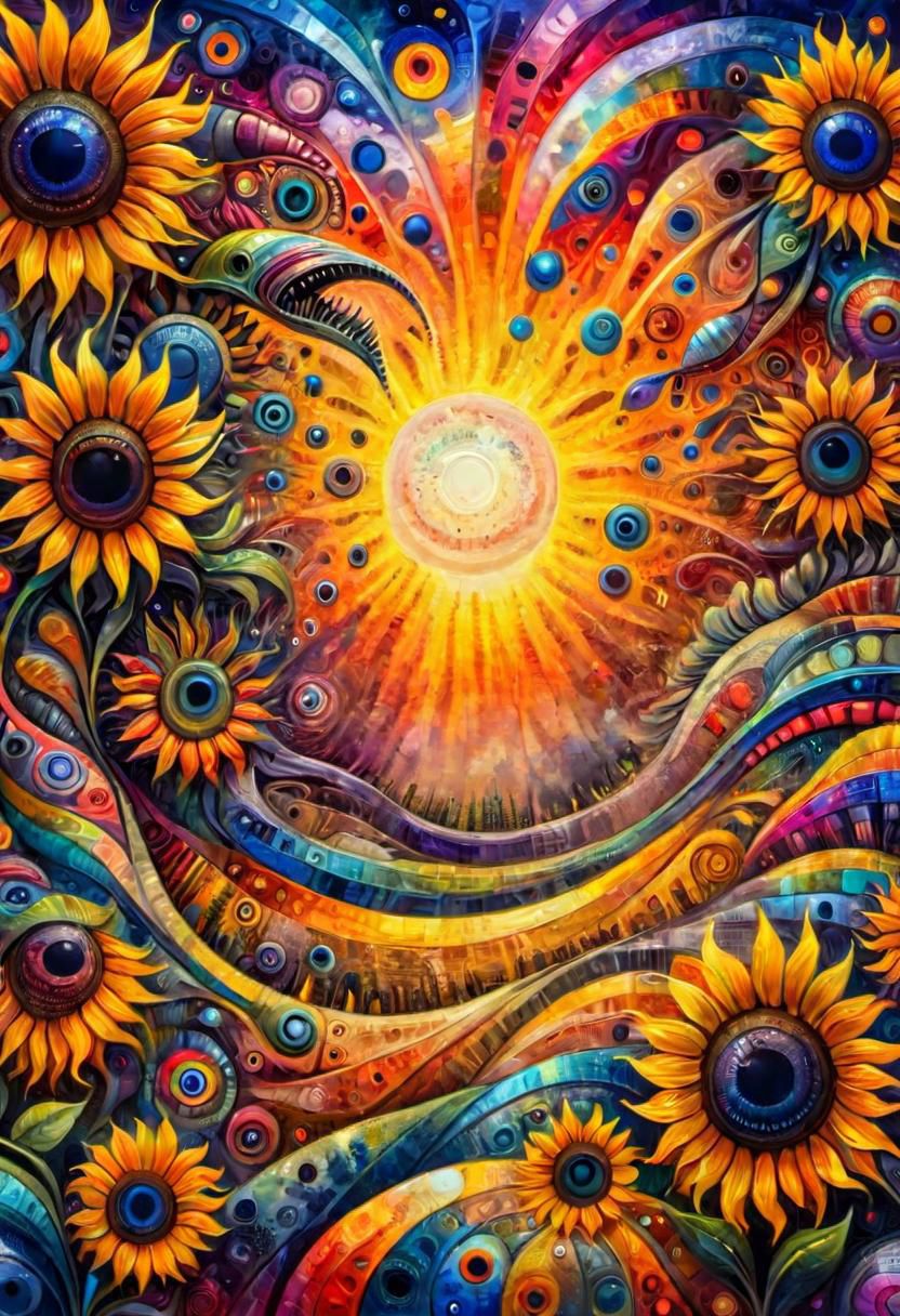 ral-colorswirl, a magnificent sunset made of millions of sunflowers on a strange and mysterious alien palette. It's very textured and detailed with dreaming lot of whirlwind multicolored and dreaming dust