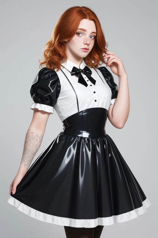 4l1c3l4t3x, short sleeves, black bow, blue dress, shiny latex dress, high heels, kneehighs, white socks, <lora:4l1c3l4t3x:0.75> <lora:age_slider_v20:1> <lora:detail_slider_v4:1> <lora:Fr3ckles:0.7> Fr3ckles, freckles, long hair, ginger hair, white background, <lora:weight_slider_v2:0.7>