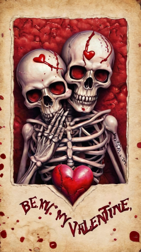 an artists interpretive depiction of a bloody valentine with the text ("BE MY VALENTINE":1.1), (japanese tattoo art style, new school tattoo art style:1.2), (a cute macabre adult valentine's day card:1.1), breathtaking, a hyperdetailed digital ink painting, high contrast, accentuated luminosity and intricate details surreal and majestic atmosphere, award-winning, professional, highly detailed, high quality, 8k, extremely detailed oil painting, multicolored, unreal 5 render, digital art, 8K artistic photography, octane render, beautiful composition, award-winning photograph, masterpiece, cute, skulls, skeletons, cartoon, love, hearts BREAK (a cute macabre adult valentine's day card with the text "BE MY VALENTINE":1.3), ("BE MY VALENTINE":1.3)