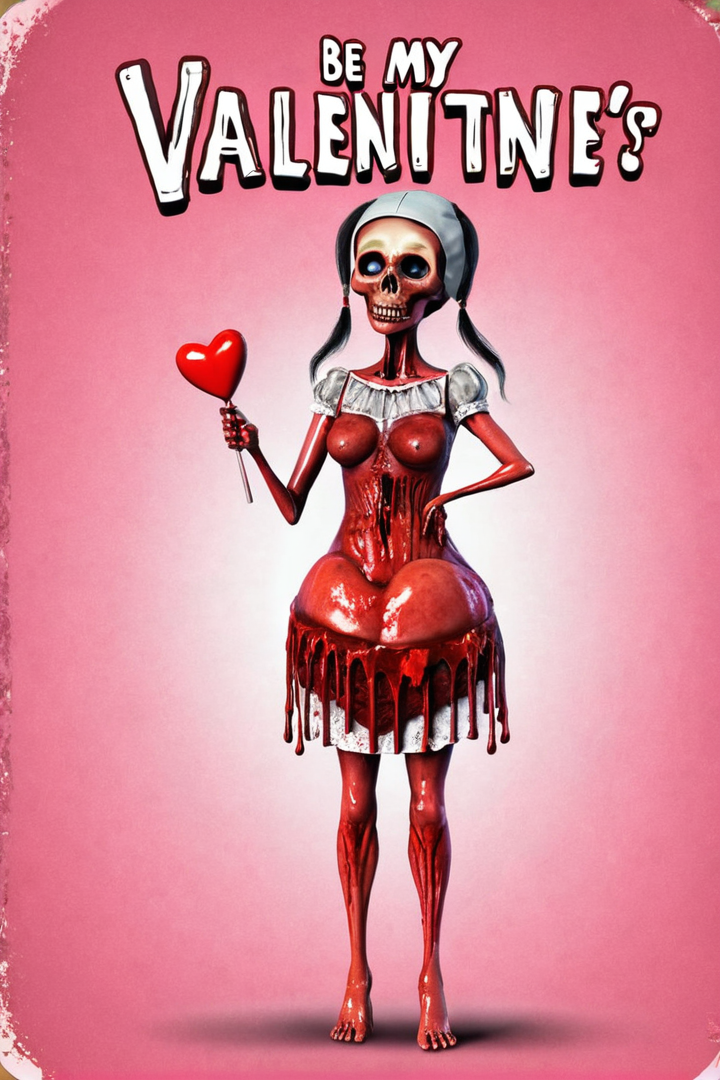 an artists interpretive depiction of the concept of a bloody valentine with the text ("BE MY VALENTINE":1.1), award-winning, professional, highly detailed, high quality, 8k, extremely detailed, multicolored, 8K, beautiful composition, masterpiece, cinematic BREAK (a cute macabre adult valentine's day card with the text "BE MY VALENTINE":1.3)